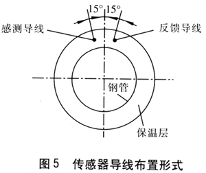 ????使用鎳鉻合金線作為傳感器導線,分為感測導線、反饋導線,兩根導線總稱為傳感器導線。供熱管道制造過程中,在每段管道中安裝兩根導線,傳感器導線布置形式見圖5。