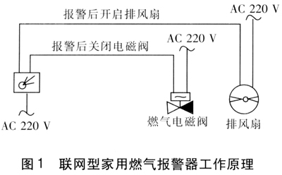 在聯網型工作方式中,燃氣管道上的緊急切斷電磁閥可與燃氣泄漏報警系統連鎖或與消防及其他智能報警控制終端模塊等連鎖,實現現場或遠程的連動控制。聯網型家用燃氣報警器的主要功能是:燃氣發生泄漏后,當超過燃氣報警濃度時系統便自動切斷該用戶的燃氣供應,并發出聲光報警信號,連動控制排風扇。聯網型家用燃氣報警器工作原理見圖1。