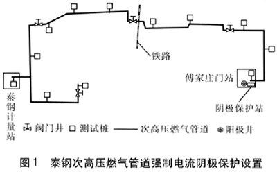 泰鋼次高壓燃氣專用管道大多位于萊蕪市郊區,且管道已修建完成,通過技術經濟比較,我公司決定對該管道采用造價低、工程量小的強制電流陰極保護方式。泰鋼次高壓燃氣管道強制電流陰極保護設置見圖1。