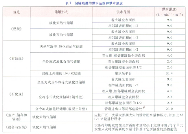 《燃規》第9.5.1條對LNG儲罐消防用水量作出了規定:“液化天然氣儲罐消防用水量應按其儲罐固定噴淋裝置和水槍用水量之和計算”。對于水槍用水量,幾項規范的要求基本相同,設計中也沒有異議;而儲罐固定噴淋的水量大,對于供水強度的選取,設計人員間爭議較大,表1是不同規范中液化天然氣及液化石油氣儲罐噴淋水量的對比。
