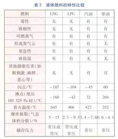 普惠飛機公司(Pratt&Whitney Aircraft)在20世紀60年代就對LNG、航空煤油進行了燃燒對比實驗,并得出LNG與燃料油相比具有更低的火焰擴散能力、更小的火焰、火焰附著能力和蔓延能力低的結論,實驗表明LNG的安全性要高于汽、柴油等燃料油。此外,美國德克薩斯大學能源經濟中心于2006年11月編寫的《LNG的安全與保安》(LNG Safety and Security)中對液化天然氣與液化石油氣、汽油、柴油類液體燃料的特性進行了比較(見表3),同樣說明了LNG的優勢。