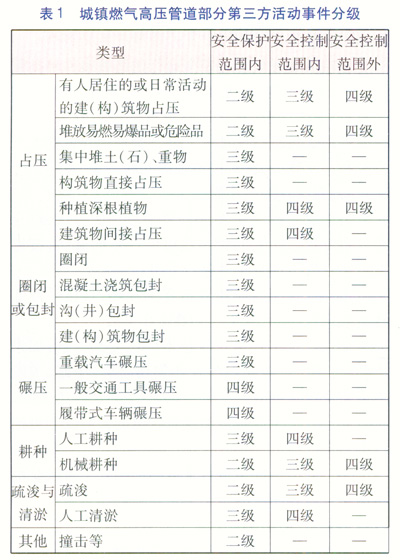 美國運輸部(DOT)的管道事故統(tǒng)計資料顯示:導(dǎo)致管道事故的最主要原因是來自于第三方的侵?jǐn)_,l971—1986年間發(fā)生的管道事故中,40%左右源于第三方損害[2]。城鎮(zhèn)燃?xì)夤艿赖谌交顒邮录N類繁多,影響形式和程度、第三方受教育的程度等其他因素共同決定其對管道的影響程度。在對第三方活動事件分級時,需抓住主要矛盾,綜合考慮其他影響因素,并使其具備可操作性,以便實施分級管理。