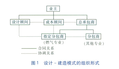 在此模式下,承包燃?xì)忭?xiàng)目的指定分包商,與總承包商是合同關(guān)系,與業(yè)主、設(shè)計(jì)顧問、成本顧問及其他專業(yè)分包商沒有合同關(guān)系,只是協(xié)調(diào)關(guān)系。燃?xì)夥职桃环矫媾c業(yè)主及其設(shè)計(jì)顧問協(xié)調(diào),進(jìn)行燃?xì)夤こ淘O(shè)計(jì)、報(bào)建及竣工驗(yàn)收工作,另一方面與總承包商及其分包商協(xié)調(diào),實(shí)施燃?xì)夤こ痰脑O(shè)計(jì)深化、采購(gòu)、施工及交付使用。