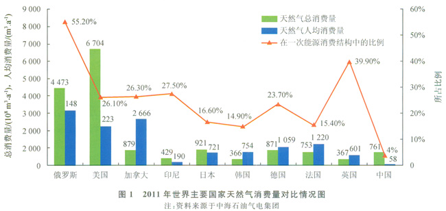目前我國新建和在建的一批LNG接收站是在“十一五”末期以及“十二五”初期被審批通過的,當時環境保護問題已日益引起中央政府的高度重視,并決定加快調整我國的能源消費結構。由于天然氣環保性能優異[1],又可大規模利用,已成為世界清潔能源的主要發展形式。中國的天然氣消費總量目前排在世界第三位,而且大有爭當亞軍的趨勢,但是人均年消費天然氣量和天然氣在一次能源中所占的比例都大大低于全球平均水平(圖1)。在多地頻現嚴重霧霾和環境污染治理的重壓之下,中國必須提升天然氣這種清潔能源的利用水平,于是政府出臺了《國家能源“十二五”規劃》,其中明確提出要大力發展清潔環保的天然氣,計劃在“十二五”末期實現天然氣在一次能源消費結構中的比重由4%左右提升至7.5%,提升3.5個百分點。