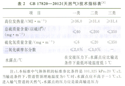 GB l7820規定了經過處理并通過管道輸送的商品天然氣分類和技術要求[3],為天然氣工業的發展制定了一個統一的產品要求(表2)。其中發熱量、總硫含量、硫化氫含量、二氧化碳含量和水露點5項關鍵控制性技術指標體現安全衛生、環保和經濟效益要求,而一類氣指標與歐、美、俄處于同等水平,實現與國際接軌,保障了進口天然氣質量,為天然氣質量控制提供了依據。