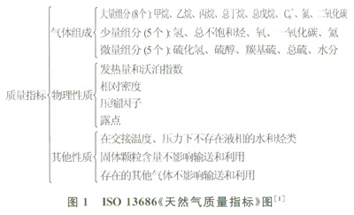 國際標準化組織(ISO)于1998年發布ISO13686《天然氣質量指標》,成為全世界天然氣質量控制的指導性準則和各國之間簽訂天然氣貿易合同的指南。該國際標準明確規定了天然氣質量必須滿足安全衛牛、環境保護、經濟利益3個方面要求。其對天然氣質量控制參數、測量單位和測量方法標準進行了規定(圖1) [1]。