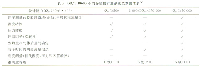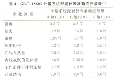 參考0IML Rl40和ENl776,GB/T l8603規定了新建和改擴建的天然氣計量站貿易計量系統的設計、配置、建設、投產運行、維護方面的技術要求[4](表3),同時給出了計量系統儀表的準確度要求(表4)。成為計量站建設和運行維護的依據。