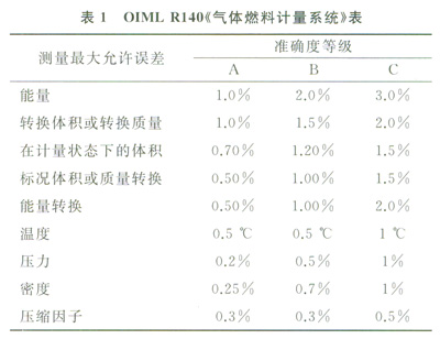 國際法制計量組織(OIML)于l998年發布Rl40《氣體燃料計量系統》[2],作為天然氣流量計量的指導性準則和各國簽訂天然氣貿易合同的指南。該技術文件對天然氣流量計量系統準確度等級和能量、質量、體積、參數換算、壓力、溫度、密度、壓縮因子的測量最大允許誤差等技術要求進行了詳細規定(表1) [2]。