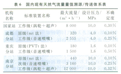 20世紀80年代,我國開始在四川成都建設天然氣流量標準裝置。l996年通過自主研發,建成質量時間法原級標準裝置,達到“90年代中期國際同類裝置的先進水平”(亞洲一流)。目前,已建立0.1%的原級標準及配套的傳遞標準和工作標準裝置,形成了完整的量傳溯源體系(表6)。