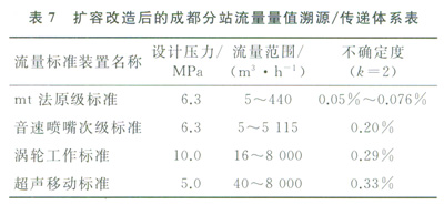 在現有天然氣流量量傳溯源體系的基礎上,通過成都分站的擴容改造,進一步提高技術水平和能力,躋身國際先進行列。成都分站擴容改造后,將建立中低壓(0.3~6.0MPa)、質量流量不確定度為0.05%~0.076%的原級標準裝置。新建的環道檢測系統作為工作標準,將現有臨界流文丘里噴嘴次級標準裝置從不確定度0.33%水平提高到小于等于0.20%(表7)。