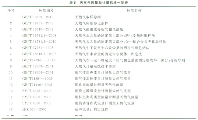 為配合GB l7820《天然氣》和GB/T l8603《天然氣計量系統技術要求》的實施,先后制定了天然氣取樣、組成分析、物性計算、能量測定、流量檢測等50余項國家和行業標準(表5),初步構建了以GB l7820《天然氣》和GB/T l8603《天然氣計量系統技術要求》為核心的質量和計量技術標準體系,整體達到國際先進水平。