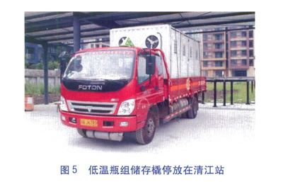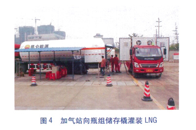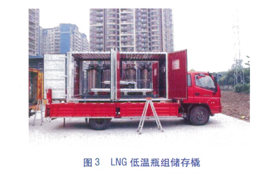 車載移動氣化調壓橇見圖2,LNG低溫瓶組儲存橇見圖3。在LNG加氣站對LNG瓶組儲存車進行了LNG帶瓶充灌,見圖4。