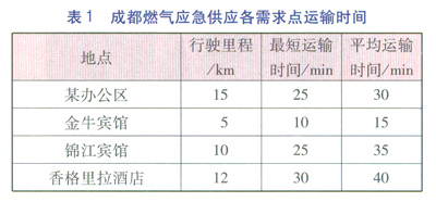LNG應急供氣設備就位后,考慮到運載LNG的車輛為危化品運輸車,行駛路線和行駛車速都有所限制,成都燃氣組織人員和運輸車輛,實地測試設備從車輛停放點至各應急供氣單位的運輸時間。從實測的數據來看,對多數地點從車輛停放點至供氣點的時間不超過40min(見表l),考慮到現場連接的時間為20min,從接到客戶電話到應急供氣車輛行駛至現場開始供氣,可以確保在60min內完成。