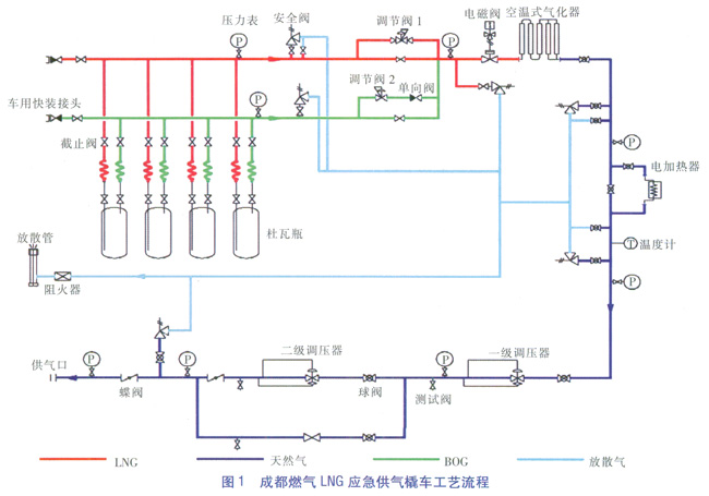 摘 要:結合成都城市燃氣的應急供氣方案,介紹采用LNG車載供應的方式對重點客戶進行應急保障的工藝流程和設備配置,通過實踐進行了驗證,效果良好。