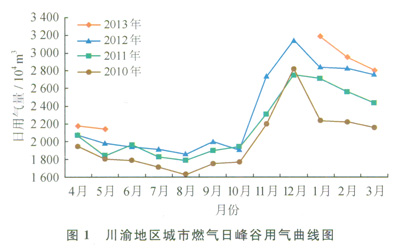 川渝地區2012年城市燃氣的冬夏日峰谷氣量最高相差約1500×104m3。圖1為川渝地區城市燃氣近幾年的峰谷用氣曲線。從圖1中可以看出,到了冬春季,用氣量明顯上升,均是在12月達到用氣量最高峰。