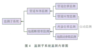監(jiān)測(cè)傳感子系統(tǒng)用于監(jiān)測(cè)災(zāi)情數(shù)據(jù)源,是管道風(fēng)險(xiǎn)評(píng)價(jià)的基礎(chǔ)信息保障,因此監(jiān)測(cè)的內(nèi)容應(yīng)包含管體應(yīng)變、管體位移、斷層兩盤(pán)位移和地震動(dòng)參數(shù)等內(nèi)容(圖4)。