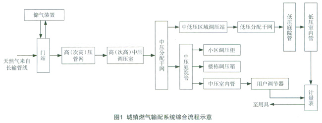 城鎮燃氣輸配系統是指自門站或人工燃氣氣源廠至用戶的全部設施構成的系統,包括門站或氣源廠壓縮機站、儲氣設施、調壓裝置、輸配管道、計量裝置等,其中儲氣、調壓與計量裝置可單獨或合并設置,也可設在門站或氣源廠壓縮機內。門站主要具有過濾、計量、調壓、加臭等功能,有的兼有儲氣功能,儲氣設施主要包括儲氣罐、儲氣管束或二者兼有。