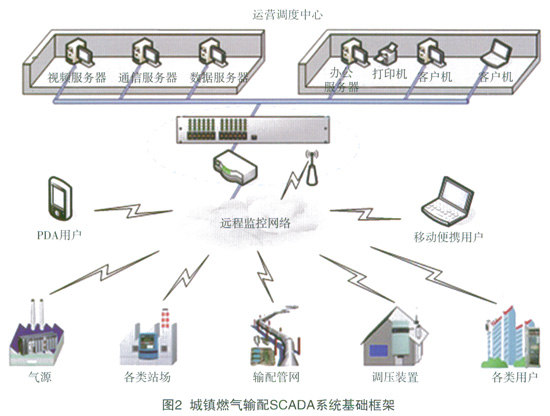 城鎮燃氣輸配SCADA系統的基礎框架如圖2所示:系統中的各類終端站分布于燃氣輸配系統的各個組成部分(氣源、各類站場、輸配管網、調壓裝置、各類用戶等),實現實時本地數據采集與監控;系統的中心站通常設置于燃氣企業生產調度中心,以從終端站實時采集到的監控數據為基礎,提供統一的信息平臺滿足企業實時監控、調度管理等各項業務需求;調度中心與各終端站之間通過遠程監控網絡進行互連,實現對監控信息遠傳與交換的承載。