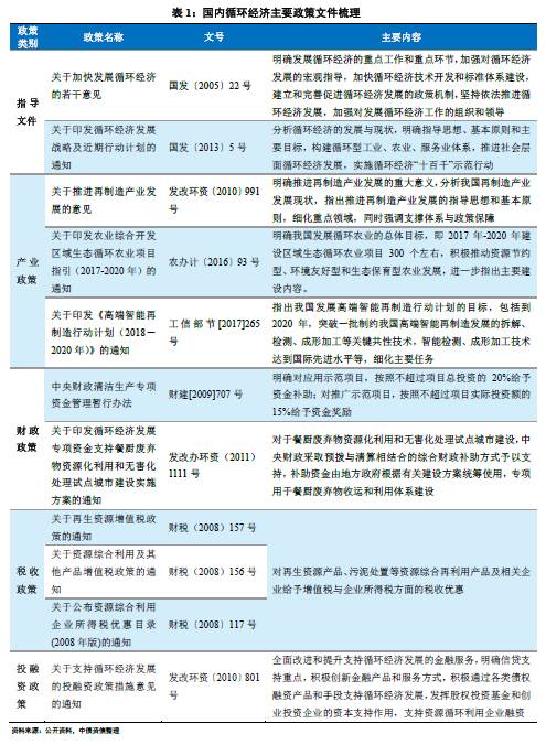 政策方面,我國循環經濟政策總體上可分為指導文件、產業政策、財政政策、稅收政策和投融資政策幾大類,其主要內容具體如下表所示。