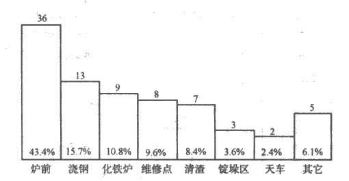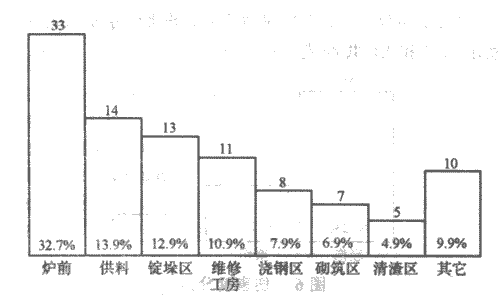 據統計,轉爐作業區共發生工傷事故46人次,其中爐下清渣10起(占21.7%),爐體維修6起(占13%),爐前平臺19起(占41.3%),上部平臺4起(占8.8%),砌爐過程中7起(15.2%)。