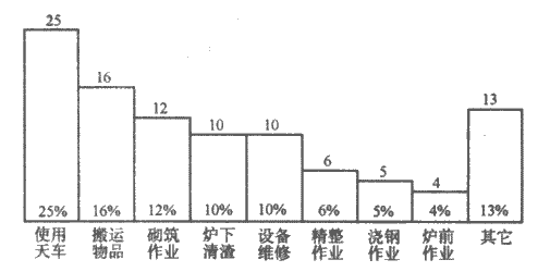 從事故發生的地點看,爐前、供料、錠垛區和維修工房為物體打擊事故多發區(占71%),見圖2。對根據發生傷害的作業種類(圖3),可知,轉爐爐前、供料區域、鋼錠(坯)區和設備維修作業是防止物體打擊的重點。特別是在這些部位使用天車作業時,更應把“防止重物墜落傷人”作為重中之重,加以防范。