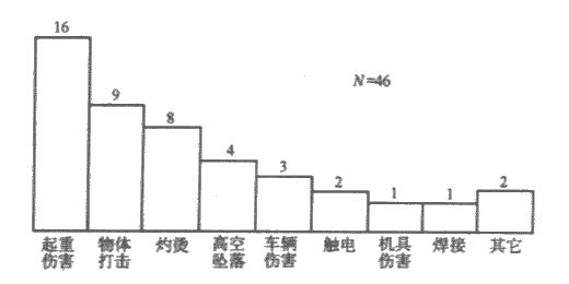 1965~2001年,轉爐煉鋼廠共發生工傷事故332起,其傷害種類分布如圖1。