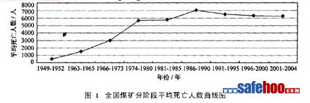 ?1990年以前,隨著煤炭開采量的不斷增加,我國煤礦死亡人數也隨之上升。主要原因是當時只追求產量,沒有認清安全與經濟之間的關系,從而導致兩者同方向變化;1990年以后,黨和政府相繼采取一系列重大舉措確保煤礦安全生產,煤礦生產狀況總體上呈現出相對穩定、趨于好轉的發展趨勢,在保證煤炭生產總量增加的同時(1990年至今,我國煤炭開采總量居世界首位),死亡人數逐年降低。具體的趨勢見圖1。