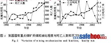 ?2 2 制約我國煤礦安全的裝備問題我國煤礦95%以上為地下開采,自然災(zāi)害十分嚴(yán)重.煤礦生產(chǎn)裝備是煤礦最基本的生產(chǎn)力要素,安全裝備是防治煤礦事故的重要手段,但目前仍有許多裝備存在適應(yīng)性不強(qiáng)、可靠性差的問題.據(jù)統(tǒng)計(jì)[6],2004年我國煤礦機(jī)械化程度平均僅為42%,其中國有重點(diǎn)煤礦采煤機(jī)械化僅為81 5%,掘進(jìn)綜合機(jī)械化僅為15 03%,國有地方煤礦和鄉(xiāng)鎮(zhèn)煤礦機(jī)械化程度更低.圖2為1990—2004年我國國有重點(diǎn)煤礦采煤機(jī)械化程度與事故指標(biāo)的變化趨勢(shì).