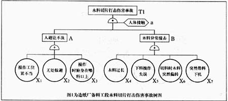 圖1為造紙廠備料工段木料切片打擊傷害事故樹圖圖中:T1為頂上事件