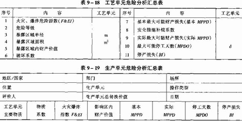 (2)分析、計(jì)算、評(píng)價(jià)需要填寫火災(zāi)、爆炸指數(shù)計(jì)算表(表9—16)、安全措施補(bǔ)償系數(shù)表(表9—17)、工藝單元危險(xiǎn)分析匯總表(表9—18)、生產(chǎn)單元風(fēng)險(xiǎn)分析匯總表(表9—19)。