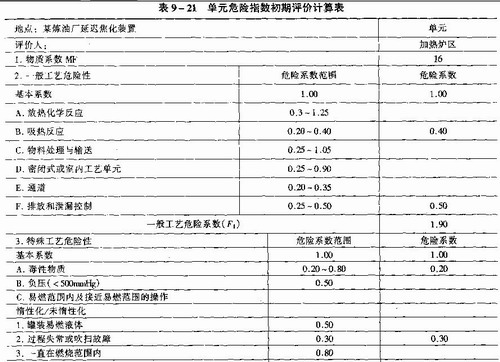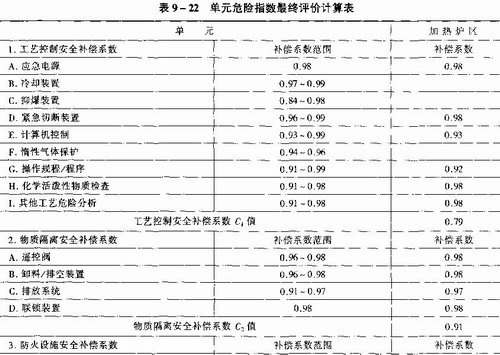 表9—21、表9—22為某煉油廠延遲焦化裝置安全預(yù)評(píng)價(jià)中加熱爐區(qū)單元《道七版》指數(shù)評(píng)價(jià)的實(shí)例。