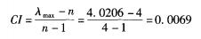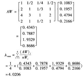 所以CR=CI /RI=0.0069/0.89=0.0077,由于CR=0.0077<0.10,故檢驗合格,判斷矩陣賦值合理。