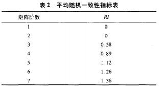 矩陣平均隨機一致性指標RI由表2查得