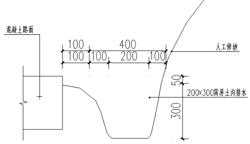 本項目排水采用200×300簡易土溝排水。本項目交叉口排水溝設置如下圖所示,本報告認為排水設施設計方案可行。
