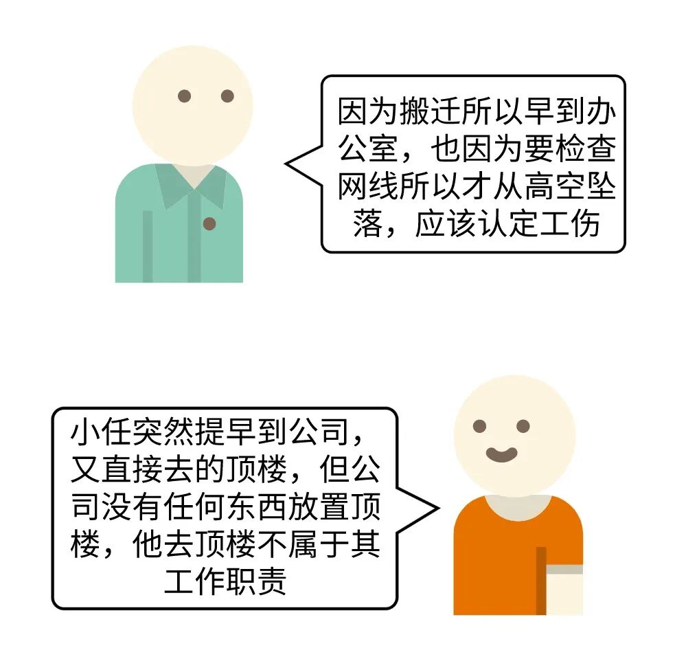 根據(jù)《工傷保險(xiǎn)條例》第十四條第(二)項(xiàng)規(guī)定,認(rèn)定工傷的要件是“工作時(shí)間前后”、“工作場(chǎng)所”、“從事與工作有關(guān)的預(yù)備性或者收尾性工作”缺一不可。小任當(dāng)天負(fù)責(zé)主持搬遷事宜,主動(dòng)提早到崗,其到崗后應(yīng)視為“工作時(shí)間前后”;其次小任去頂樓天臺(tái)查看網(wǎng)絡(luò)是其工作職責(zé)范圍,因其特殊的工作職責(zé),其工作場(chǎng)所必然包括一定范圍的延申;再者小任查看網(wǎng)絡(luò)的行為屬于“預(yù)備性工作”。