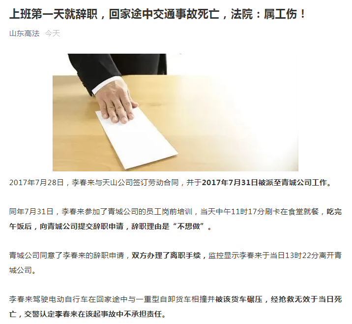 關(guān)于第一個(gè)爭(zhēng)議焦點(diǎn),李春來(lái)離職當(dāng)天發(fā)生的交通事故是否屬于下班途中。
