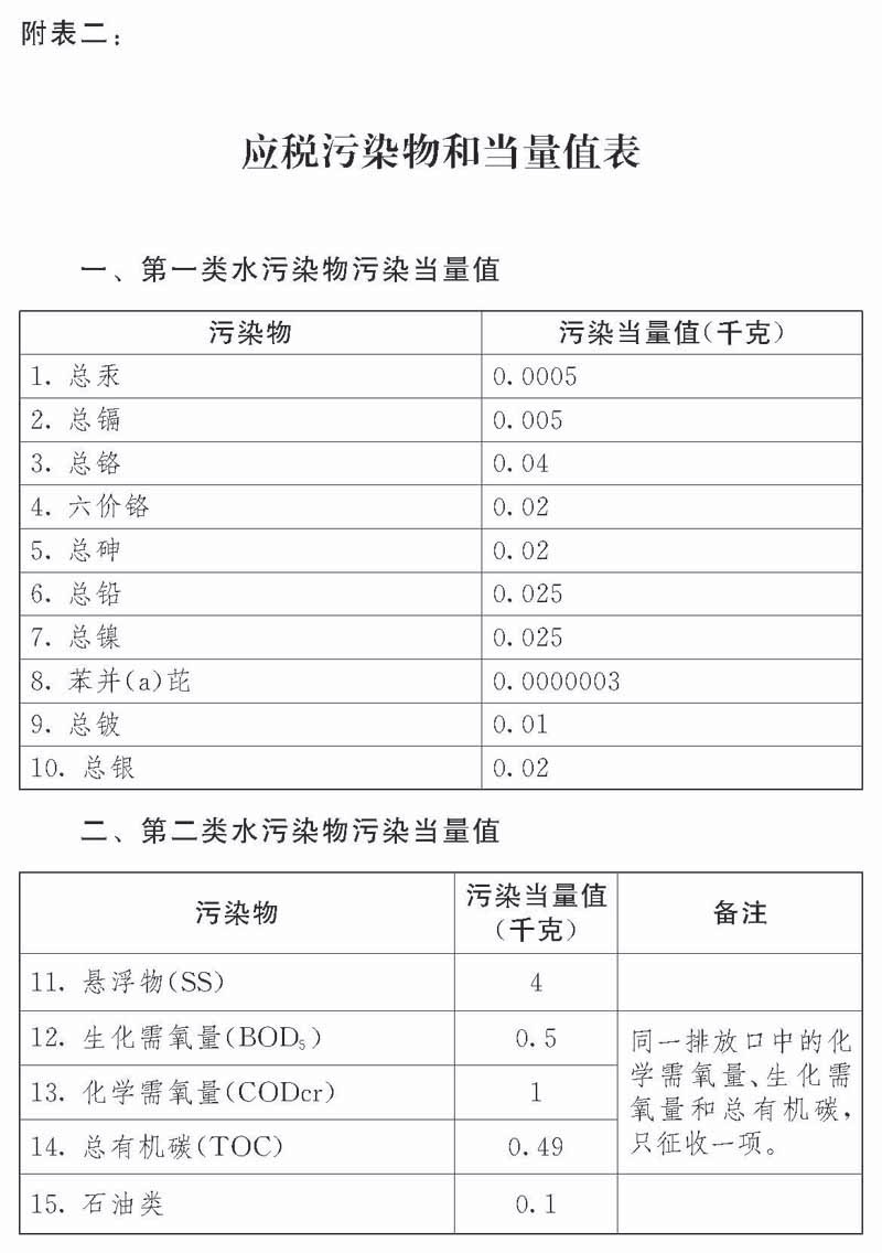 ????第八條 應稅大氣污染物、水污染物的污染當量數(shù),以該污染物的排放量除以該污染物的污染當量值計算。每種應稅大氣污染物、水污染物的具體污染當量值,依照本法所附《應稅污染物和當量值表》執(zhí)行。