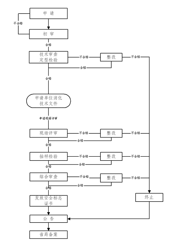 已定型產(chǎn)品或安全標(biāo)志有效期滿需換證的產(chǎn)品申辦安全標(biāo)志的程序,主要包括:申請、技術(shù)審查、現(xiàn)場評審、產(chǎn)品抽樣檢驗、綜合審查。符合條件的,發(fā)放有效期為2~4年的安全標(biāo)志證書。