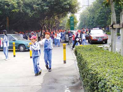 華僑城中、小學(xué)門口:學(xué)生與汽車爭快