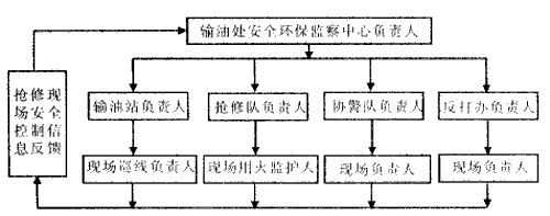 ??? 長輸管道的搶修施工安全管理網(wǎng)絡(luò)見圖1。要明確各負責人的職責,相應的管理規(guī)定和要求要以文件的形式下發(fā)到輸油處所屬的各單位。
