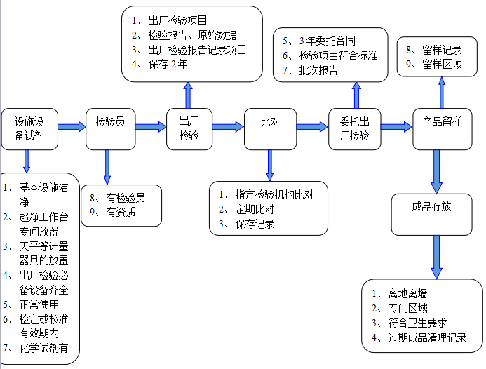 檢驗項目:檢驗室設施、設備、化學試劑情況;應具備相應能力的檢驗員;出廠銷售成品是否具有出廠檢驗;自行出廠檢驗公司實驗室是否具有測量比對;委托檢驗情況;產品留樣情況;成品庫成品存放是否符合要求。
