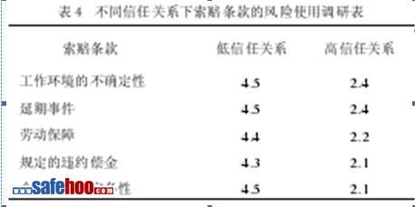 ?????? 無論是風險的分配還是糾紛的解決,相互信任都是重要基礎。國外一項研究表明:信任程度的高低直接決定了索賠條款的使用,而索賠條款的使用是增加工程成本的一個重要方面。表4 為在低信任和高信任的關系下索賠條款的風險使用的調研表(5分制)[7]。