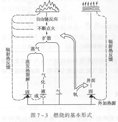 不論是有焰燃燒還是無焰燃燒,燃燒過程十分復雜,其維持燃燒的基本形式,如圖7—3所示。固體可燃物經(jīng)高溫分解產(chǎn)生氣體、可燃液體的蒸氣和可燃氣體燃燒時,出現(xiàn)火焰是有焰燃燒。有些固體,如焦炭、木炭等,它由固態(tài)的碳直接參與氧化反應,這種燃燒是不出現(xiàn)火焰的表面燃燒,是無焰燃燒。有的固體,如煤、木材等,燃燒開始為有焰燃燒,之后繼續(xù)進行無焰燃燒。