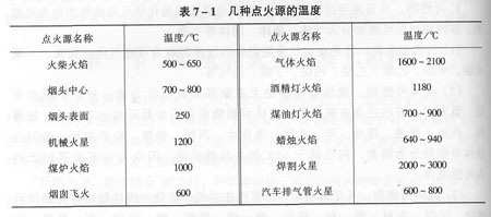 在油庫加油站中常見的造成火災危害的點火源主要有明火、高溫表面、電熱能、機械熱能等。表7—1列出了幾種點火源的溫度。點火源的溫度越高,越易引起可燃物的燃燒。