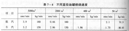 4.儲罐直徑。可燃物和易燃液體儲罐直徑對液體物質(zhì)燃燒速度影響很大。—般是隨儲油罐直徑增大,燃燒速度加快。消防科研單位試驗數(shù)據(jù)見表7—4。
