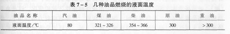 (1)油品燃燒的液面溫度。油晶燃燒有大量的輻射熱產(chǎn)生,對油品表面不斷加熱,油品液面溫度升高,揮發(fā)增強。油品揮發(fā)吸收大量的氣化熱,當輻射加熱與氣化吸熱達到熱平衡時,油品液面溫度達最大值。輕質(zhì)油品揮發(fā)強,吸熱多,液面溫度較低;重質(zhì)油晶揮發(fā)小,吸收熱量少,液面溫度較高。表7—5是幾種油品燃燒的液面溫度。