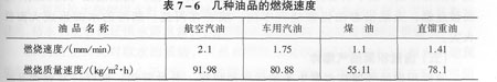 (2)油品燃燒的速度。油品燃燒速度受油罐直徑、風力、氣溫等的影響。輕質(zhì)油品其速度基本一定,原油、重油的燃燒速度先快后慢。表7—6是幾種油品燃燒速度的參考數(shù)據(jù)。含水油品(原油、重油)若含水量超過8%時,油品呈乳化狀,不燃燒;含水量4%—8%時,燃燒不穩(wěn)定,含水量小于4%時,燃燒穩(wěn)定。