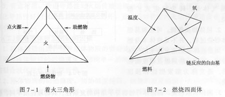 2.有焰燃燒,由于燃燒過程中存在未受抑制的游離基(自由基)作中間體,因而燃燒三角形增加了一個空間坐標,形成了燃燒四面體,如圖7—2所示。有焰燃燒也有三個特點:一是燃燒過程中未受到抑制,形成連鎖反應,存在游離基(自由基);二是擴散并自動地連續(xù)燃燒,釋放能量,達到有焰燃燒的溫度;三是可燃物呈蒸氣或氣體狀態(tài)。