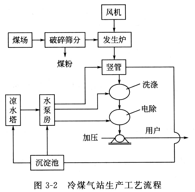 (2) 冷煤氣站?冷煤氣站經常作為發生爐煤氣集中供應的中心,由于冷煤氣站煤氣經過凈化冷卻,便于輸送,在使用中便于調節,對洗滌煤氣的廢水和廢渣便于集中處理,但冷煤氣站投資大,占地面積大,熱利用率也較熱煤氣低,而生產管理上較熱煤氣站方便。