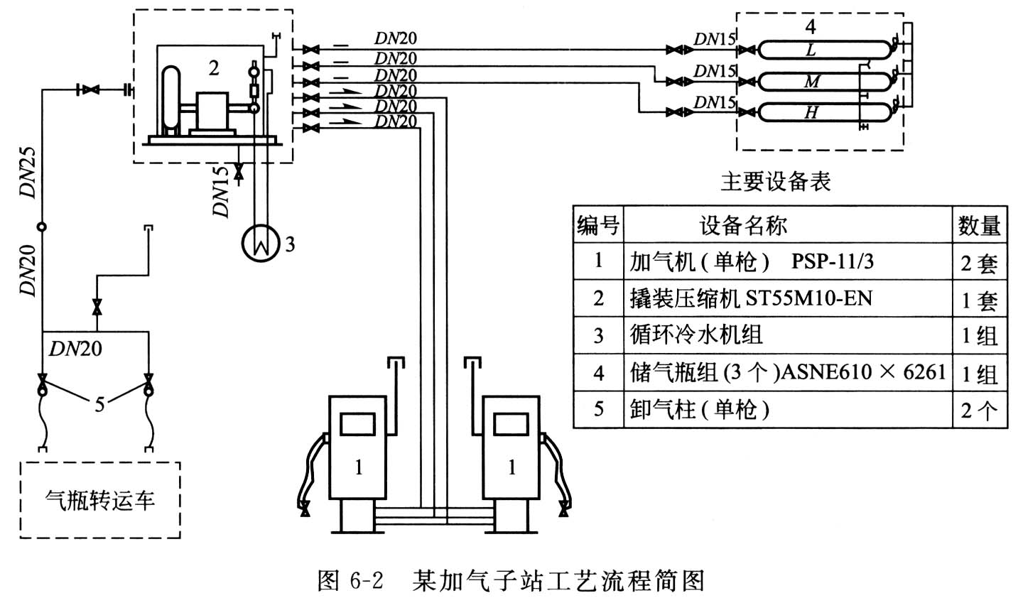加氣子站與加壓母站不同之處在于其氣源壓力很高(氣瓶轉運車額定壓力為20MPa),也不需要對天然氣再進行預處理。對負荷不均勻的快充加氣系統,除了可配置容量和級數較少的多級壓縮機外,在加氣作業快速、精確、安全和高效方面有很高的要求。圖6-2為某加氣子站工藝流程簡圖。